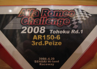 昨年、一昨年と、アルファロメオチャレンジ東北は、表彰台に乗っても、カップは手渡されるものの、表彰台を降りる時に主催者に返さなければならなかった。それが残念だった。やっぱり、表彰台に立つからには、記念になるものが欲しい。